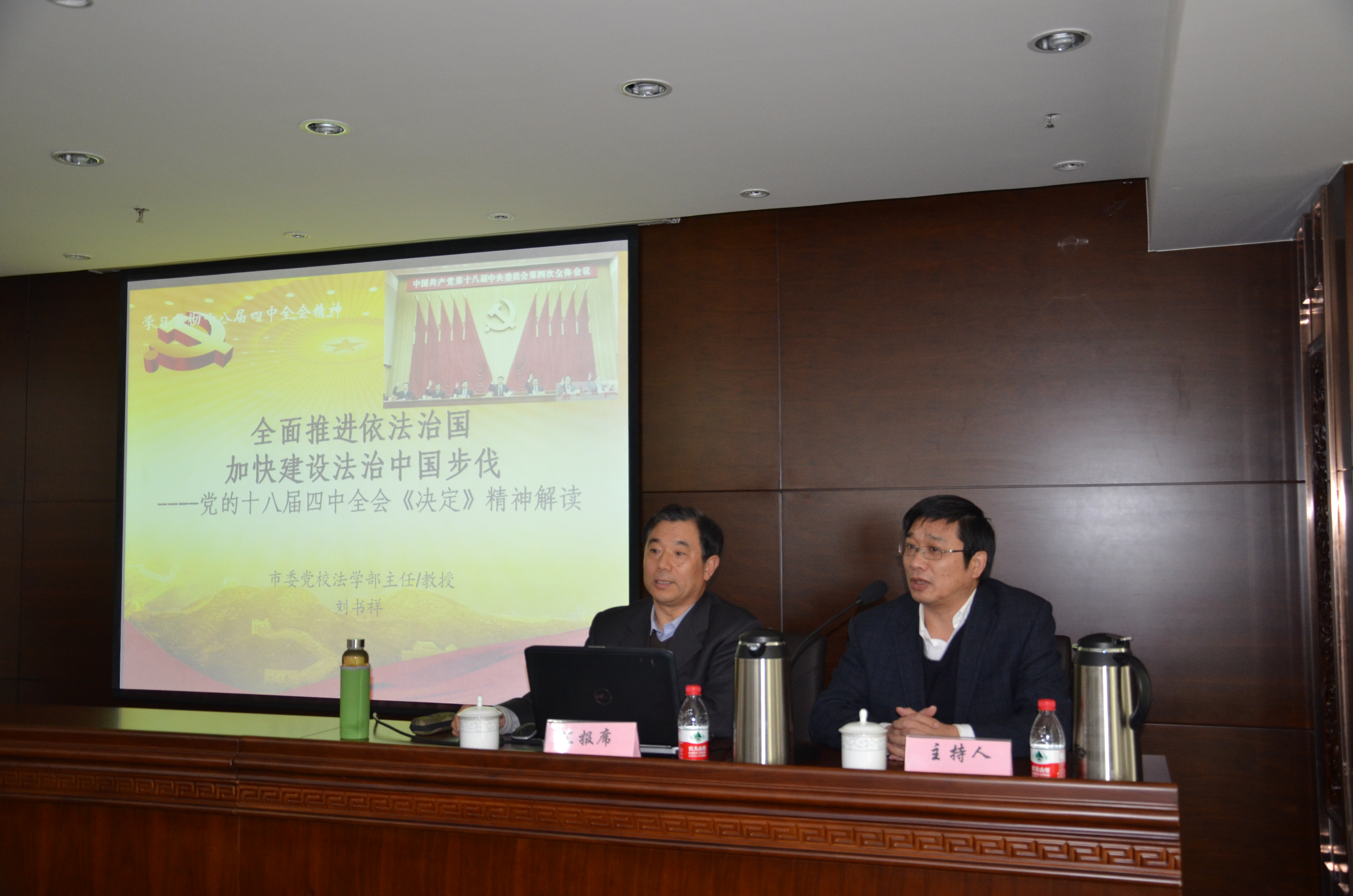 會(huì)上,劉書祥教授把黨的十八屆三中全會(huì)和四中全會(huì)緊密聯(lián)系,深入分析了全面推進(jìn)依法治國(guó)與全面深化改革的關(guān)系;回顧了我黨依法治國(guó)理念的形成和發(fā)展,進(jìn)一步明確了《中共中央關(guān)于全面推進(jìn)依法治國(guó)若干重大問(wèn)題的決定》是黨的法治建設(shè)理論與實(shí)踐深化的重大成果;從《決定》的重大意義、指導(dǎo)思想、總體目標(biāo)、基本原則、主要任務(wù)入手,進(jìn)一步闡釋了《決定》的新觀點(diǎn)、新舉措。報(bào)告緊扣主題、條理分明、分析透徹,對(duì)于各級(jí)領(lǐng)導(dǎo)干部全面理解、準(zhǔn)確把握四中全會(huì)精神進(jìn)行深入解讀和引領(lǐng),起到了重要的啟發(fā)和推動(dòng)作用。