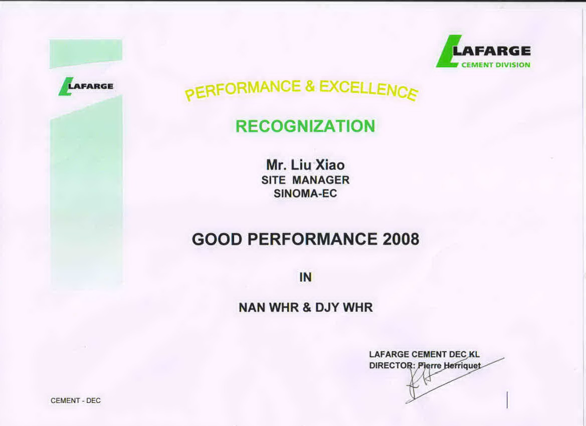 6月10日,中材節能董事長張奇攜主管工程副總經理魏文華專程拜會了拉法基四川地區總裁王鐵國及拉法基四川地區工業總監多美尼克先生。王鐵國對中材節能在都江堰余熱發電項目上的突出表現給予了高度評價。在去年“5.12”四川汶川大地震中,都江堰項目距震中僅40公里,受到了嚴重損害。中材節能本著高度負責的態度,克服各種困難,及時復工,履行了一個負責任的承包商應盡的義務,樹立了SINOMA的品牌。他認為在世所罕見的不可抗力面前,中材節能以自己的實際行動確立了是拉法基認可的合格的總包商的重要地位。多美尼克也認為中材節能是目前唯一一個在中國境內,執行拉法基項目能夠獲得業主獎勵的公司。同時,他也認為中材節能都江堰項目的管理團隊是優秀的團隊,現場經理劉宵先生也是目前中國境內唯一獲得拉法基頒發“突出表現獎”的項目管理者。