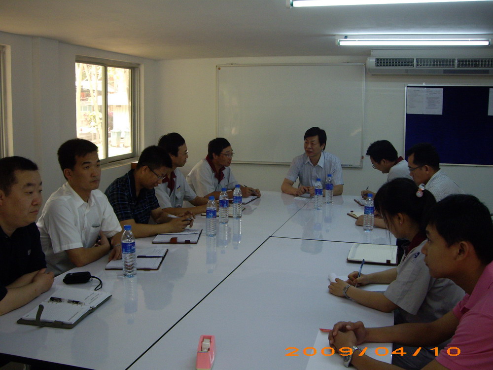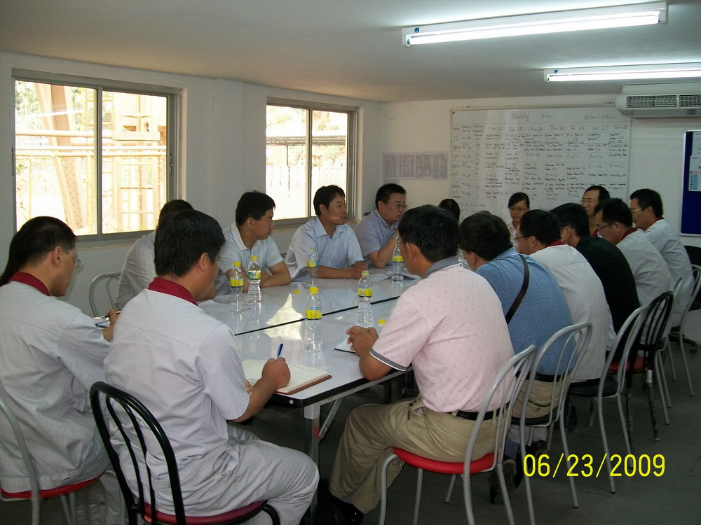 4月,泰國傳統(tǒng)的頌干節(jié)(相當(dāng)于中國的春節(jié))到來前期,張奇董事長率領(lǐng)市場部、技術(shù)部、采購部等部門負責(zé)人來到京都項目現(xiàn)場指導(dǎo)檢查工作。張董事長不顧旅途勞頓,清晨六點多即離開曼谷趕往項目現(xiàn)場所在地薩拉布里市郊的京都水泥廠。到達項目現(xiàn)場臨建辦公室后,隨即聽取了項目經(jīng)理吳蘇軍代表現(xiàn)場項目部所作的工作匯報。根據(jù)匯報,結(jié)合項目當(dāng)前總體執(zhí)行情況,張董事長肯定了現(xiàn)場項目部的工作,并且指出,京都項目目前的總體執(zhí)行情況符合公司制訂的計劃,要有信心依照總承包合同圓滿完成該項目。張董事長同時強調(diào)了京都項目的重要性,指示大家對后面的工作要盡早作出計劃,對各種可能出現(xiàn)的情況要做好充分準備,要適應(yīng)業(yè)主的管理模式,在保證項目如期完成的同時,提高公司的項目管理水平,樹立中材節(jié)能更高的企業(yè)形象。王毅等三位部長也從各部門角度提出了具體的意見和建議。隨后,張董事長一行在項目部全體人員的陪同下查看了現(xiàn)場施工區(qū)域。