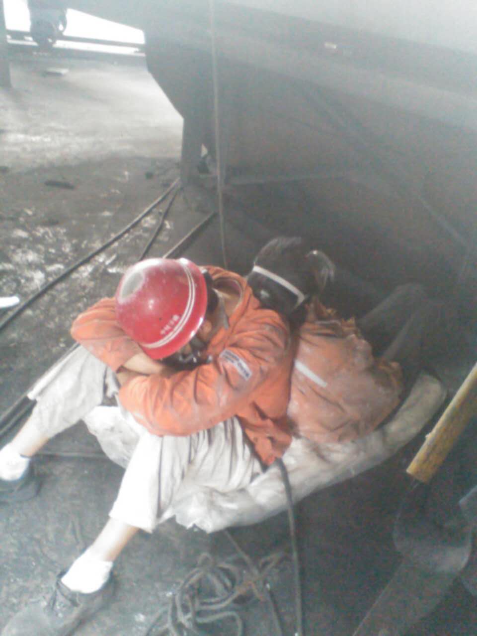 在高溫下連續(xù)作戰(zhàn)二十幾個小時,他們已經(jīng)筋疲力盡,實在太困了,就在換班的間隙,互相依偎睡著了……
